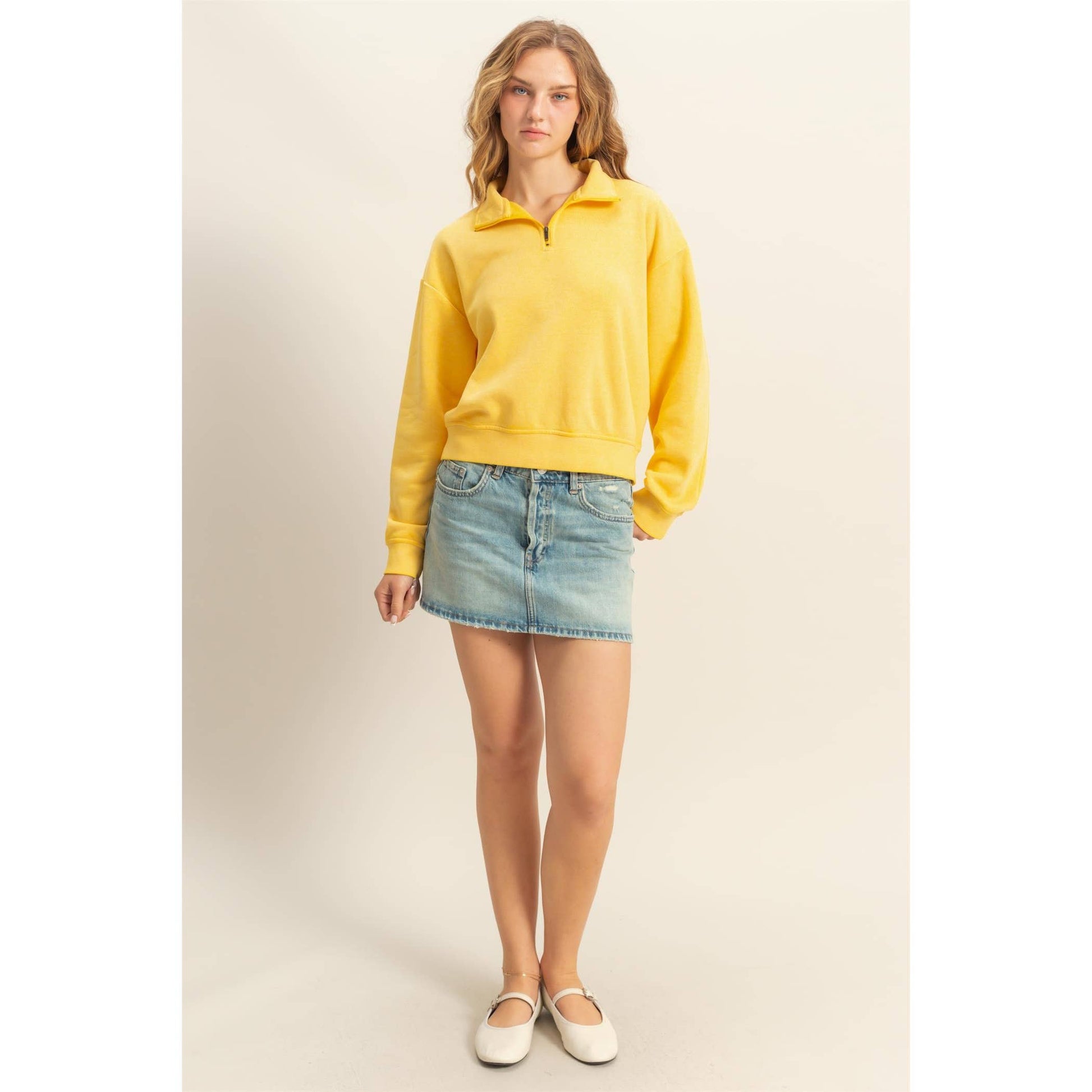 Take A Break And In This Brushed Terry Knit Sweatshirt That Shapes Into A Cute Top That Has A Standing Collared Neckline Boasting A Half Zipper At Front, Long Sleeves With Drop Shoulders, And Banded Cuffs. A Casual Boxy Bodice Ends With A Banded Hem.