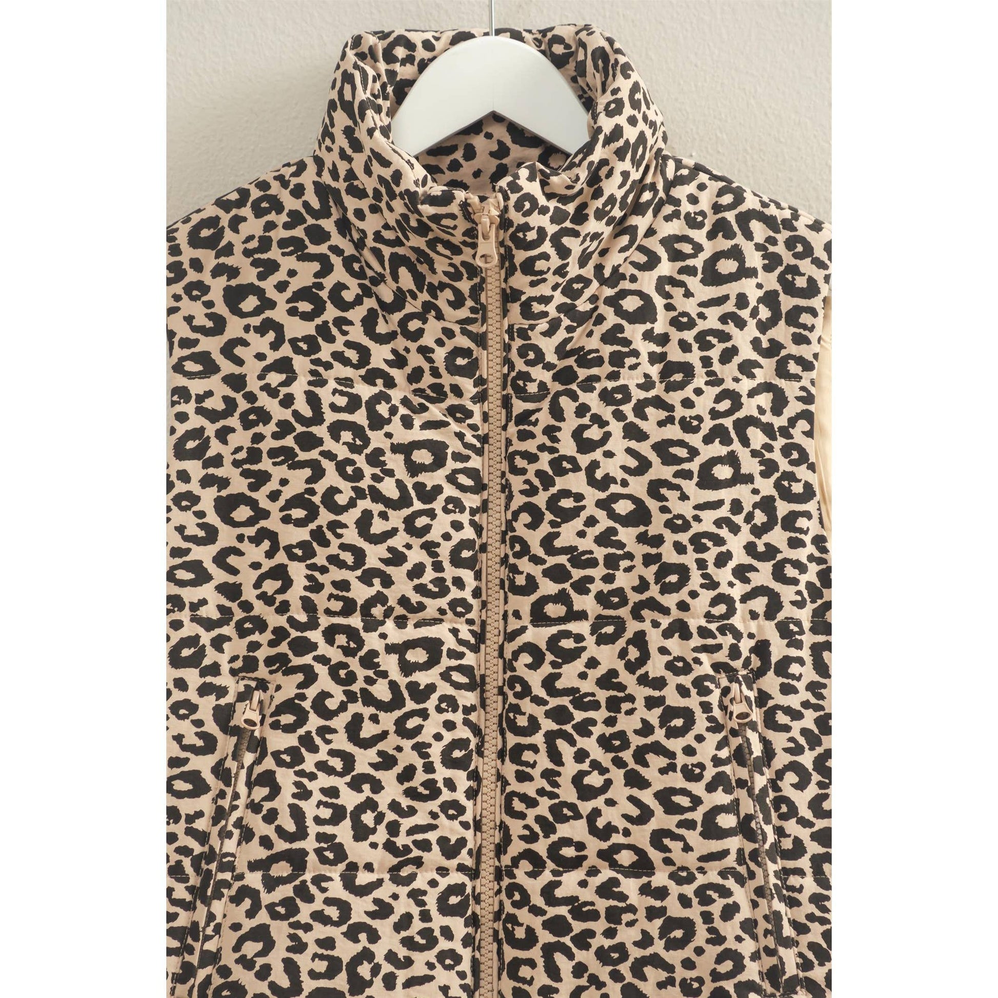Make a statement with this standout leopard print puffer vest. Ideal for layering, this vest offers a structured silhouette, enhancing any outfit with a touch of wild sophistication.