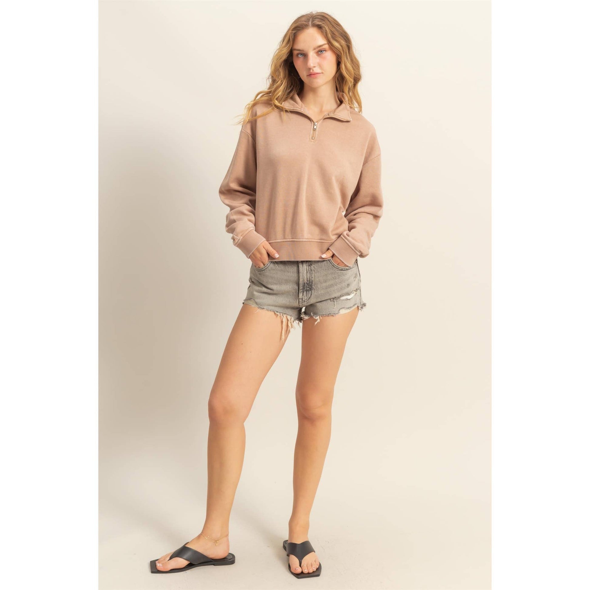 Take a break and in this brushed terry knit sweatshirt that shapes into a cute top that has a standing collared neckline boasting a half zipper at front, long sleeves with drop shoulders, and banded cuffs. A casual boxy bodice ends with a banded hem.