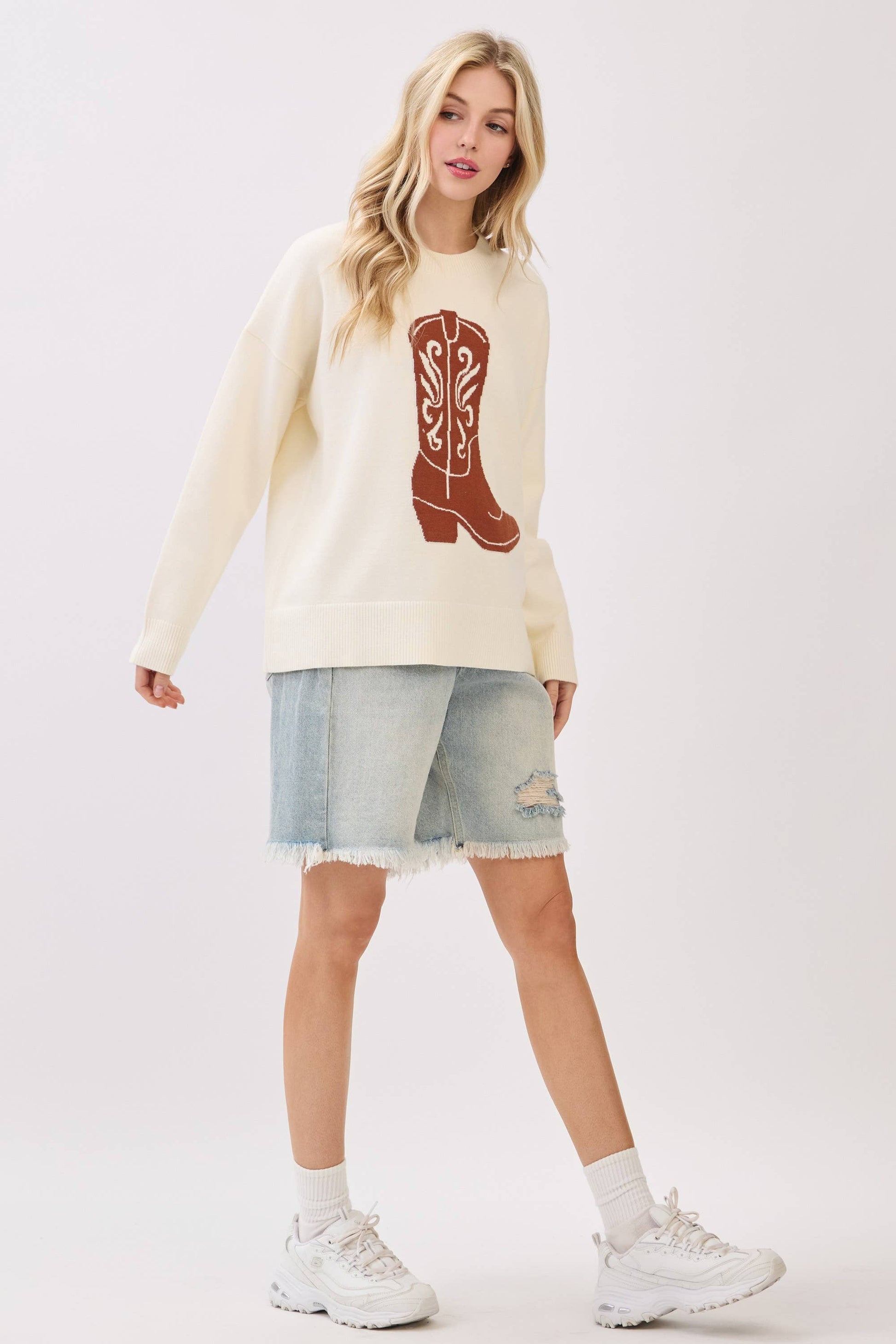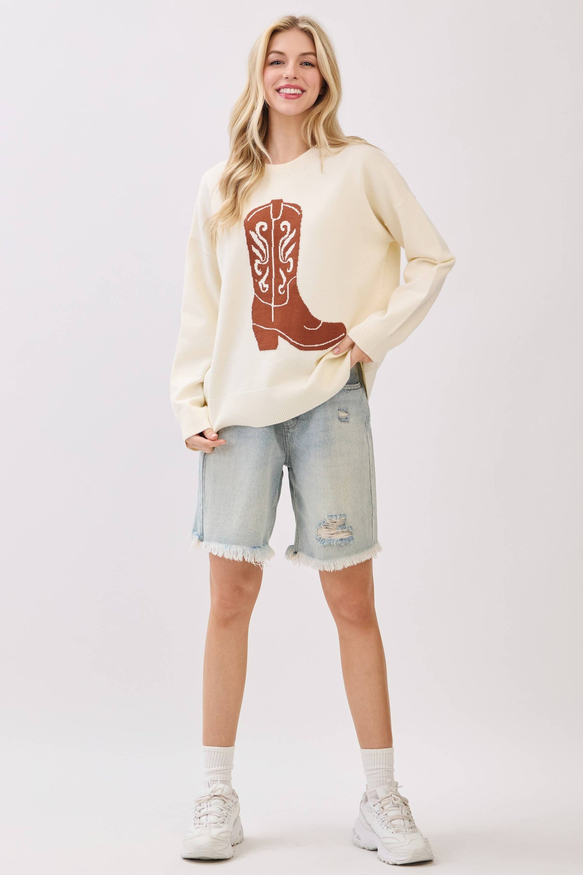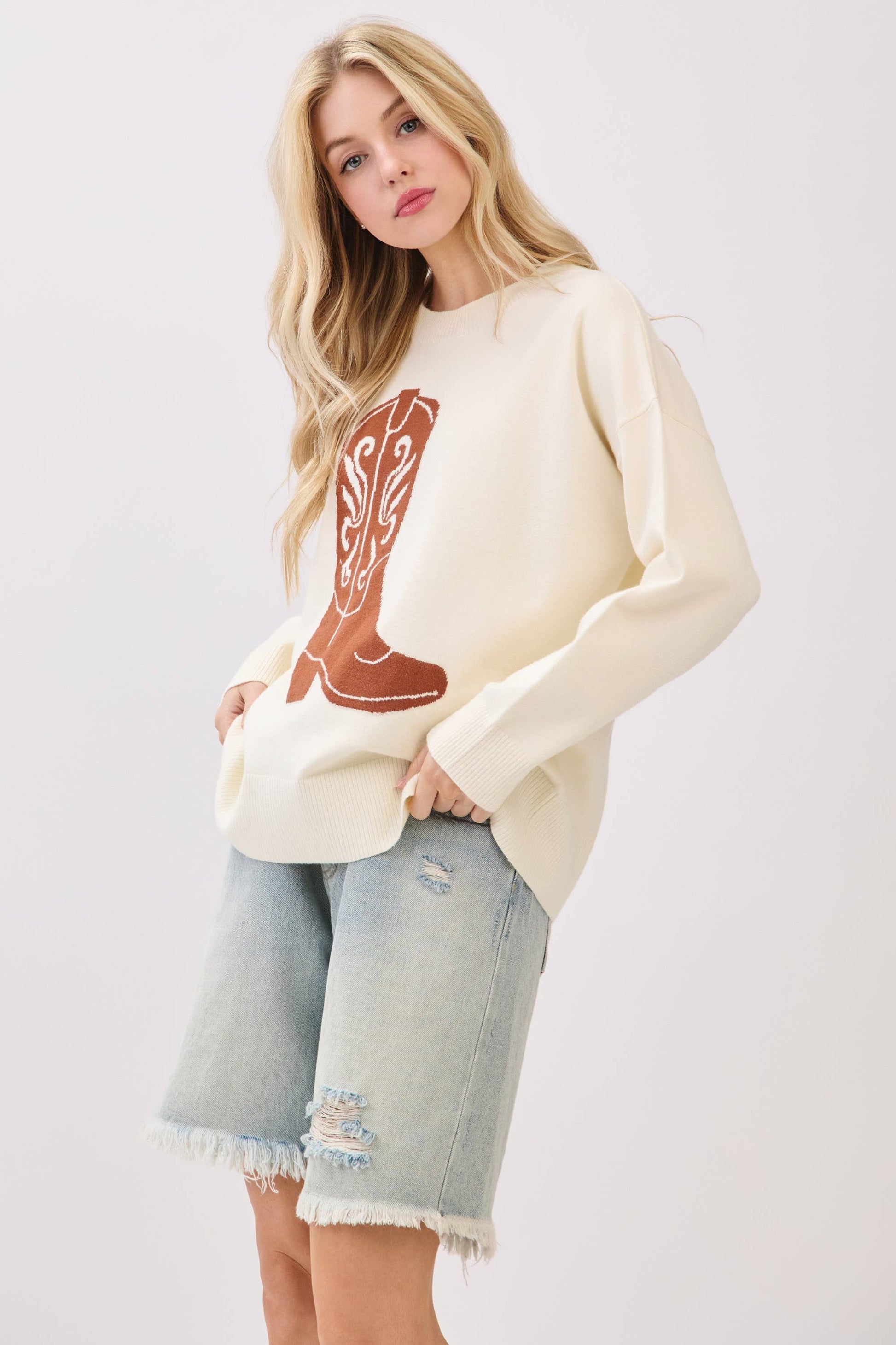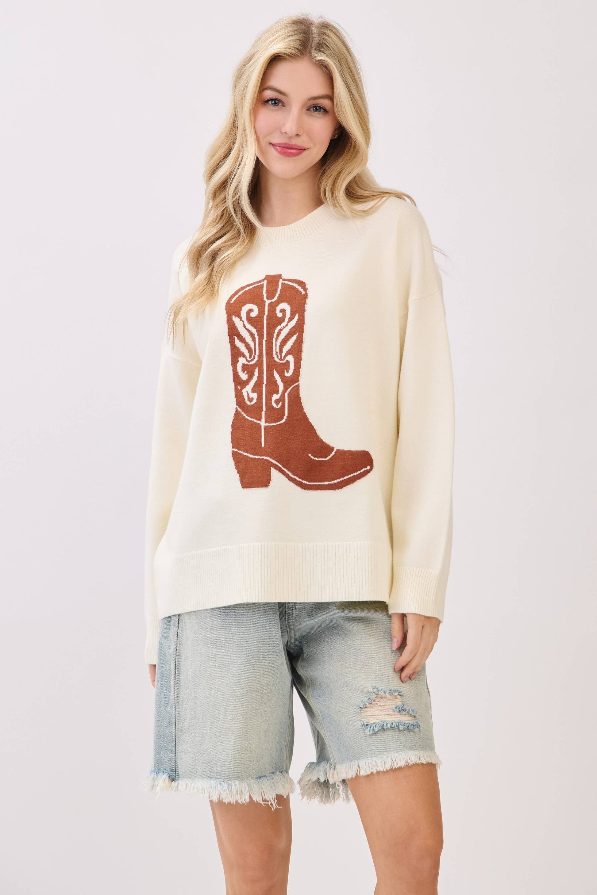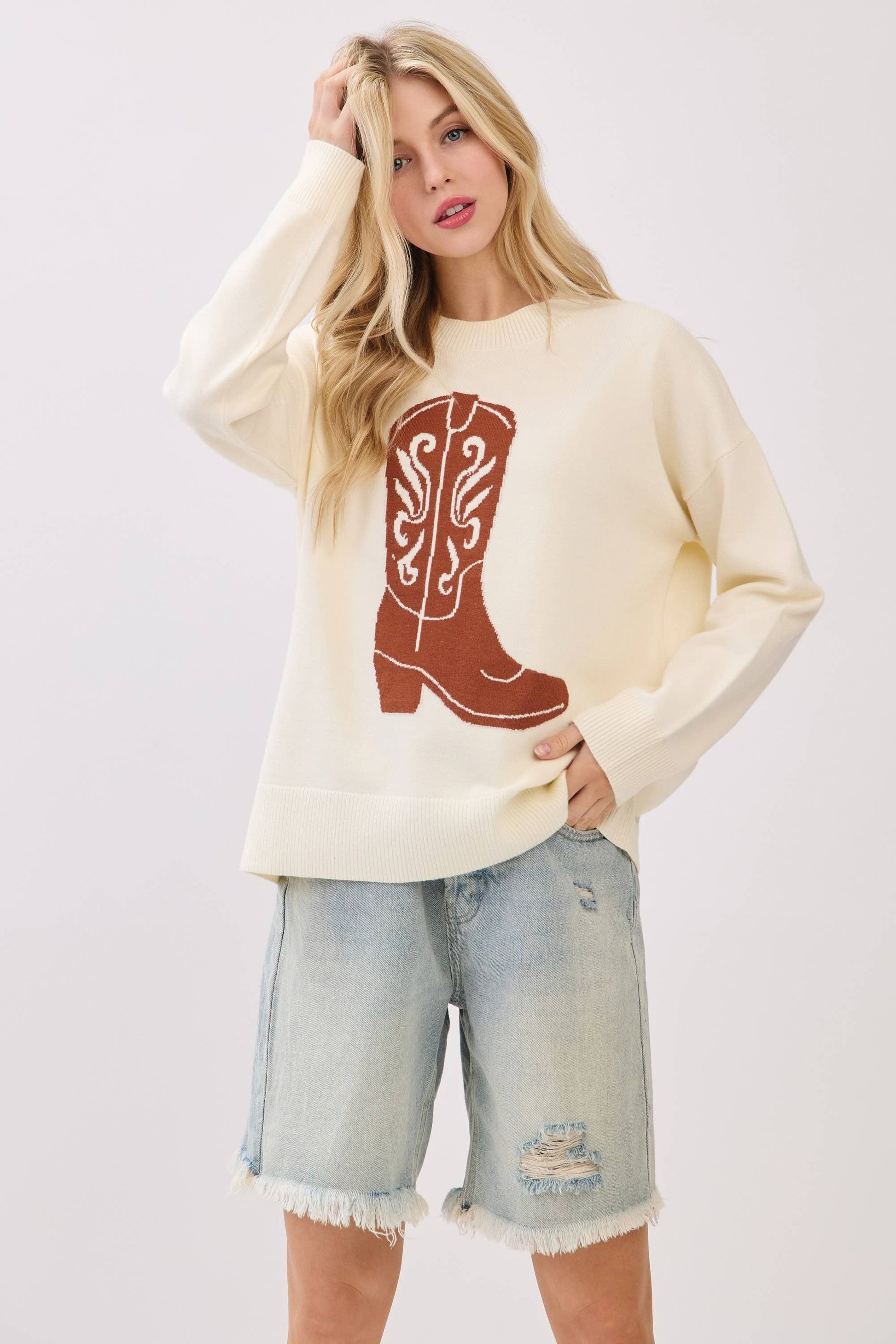 Saddle up in cozy Western style with this oversized sweater featuring a bold cowboy boot graphic across the front. The relaxed fit, ribbed hems, and soft knit texture make it perfect for layering through chilly fall gamedays or weekend adventures. With a statement boot motif and rustic charm, this piece brings rodeo-ready vibes to any casual look. cowboy sweater, western boot sweater, gameday western knit, boot graphic pullover, cozy country sweater, oversized fall sweater, cowgirl chic knit, rustic gameday style, rodeo sweater, western fall outfit, boot design top, comfy fall knitwear