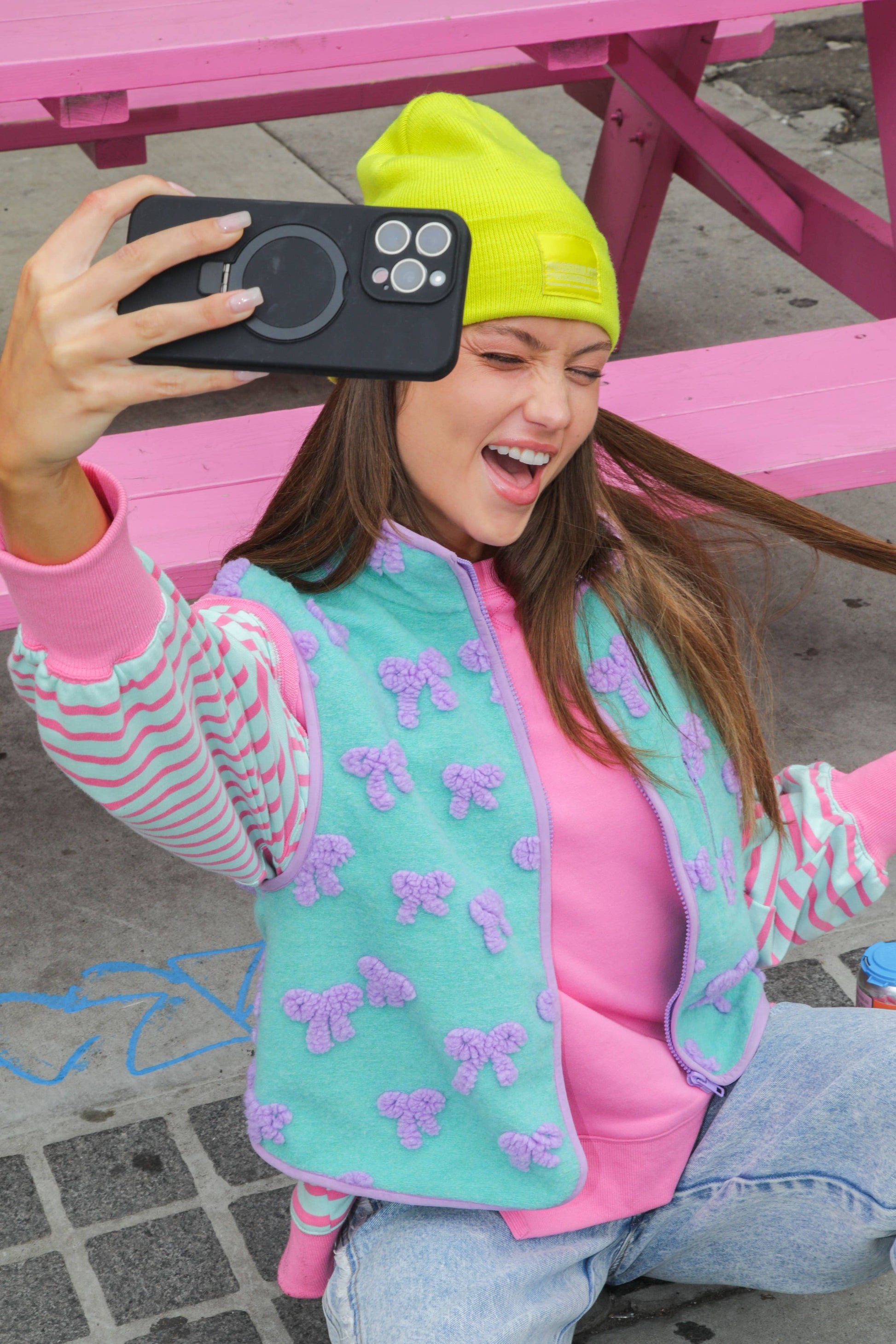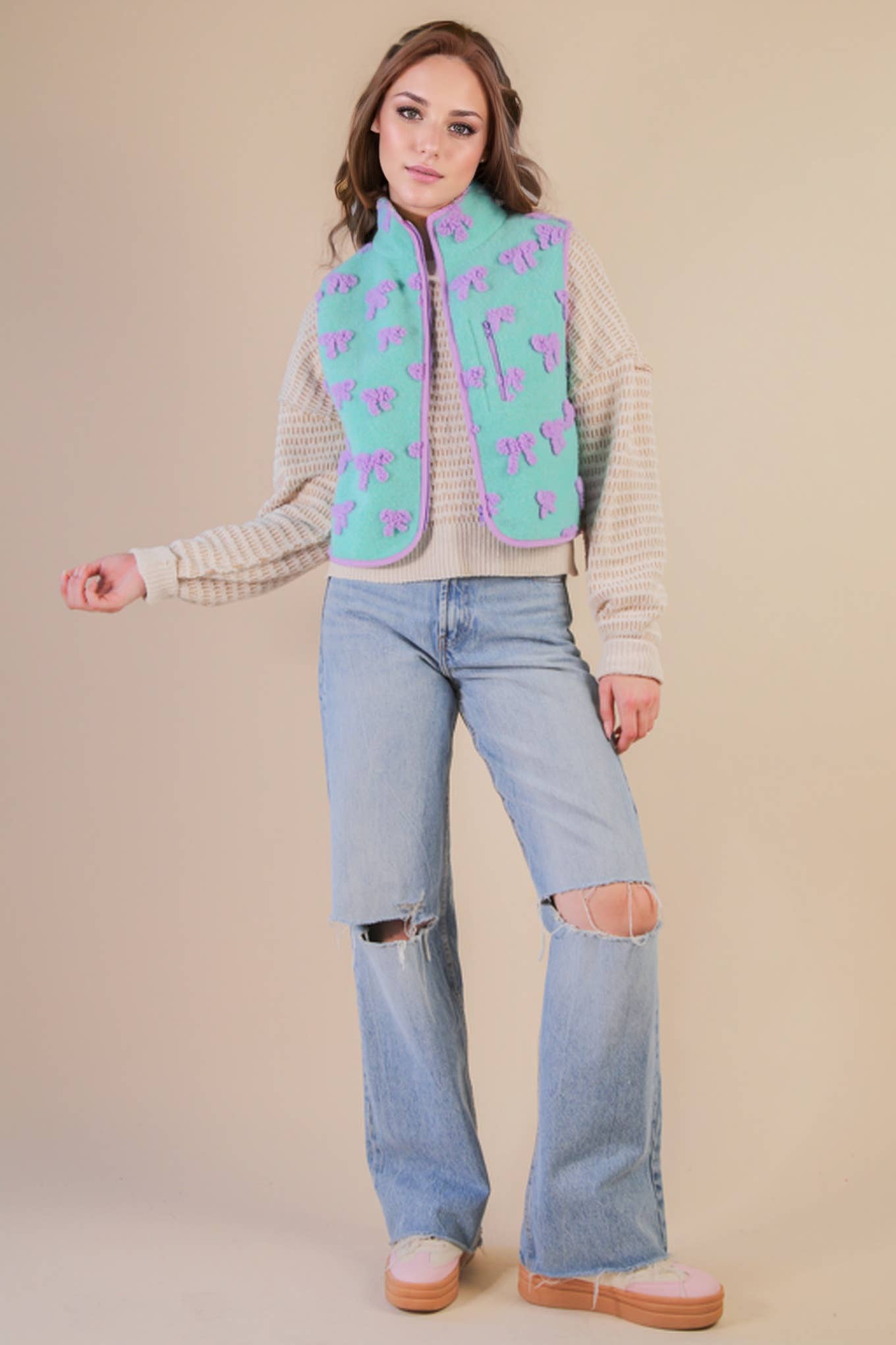 Textured Bow & Floral Printed Vest